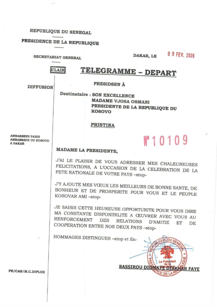 In his message, President Faye conveyed his warmest congratulations to President Osmani and the citizens of Kosovo.