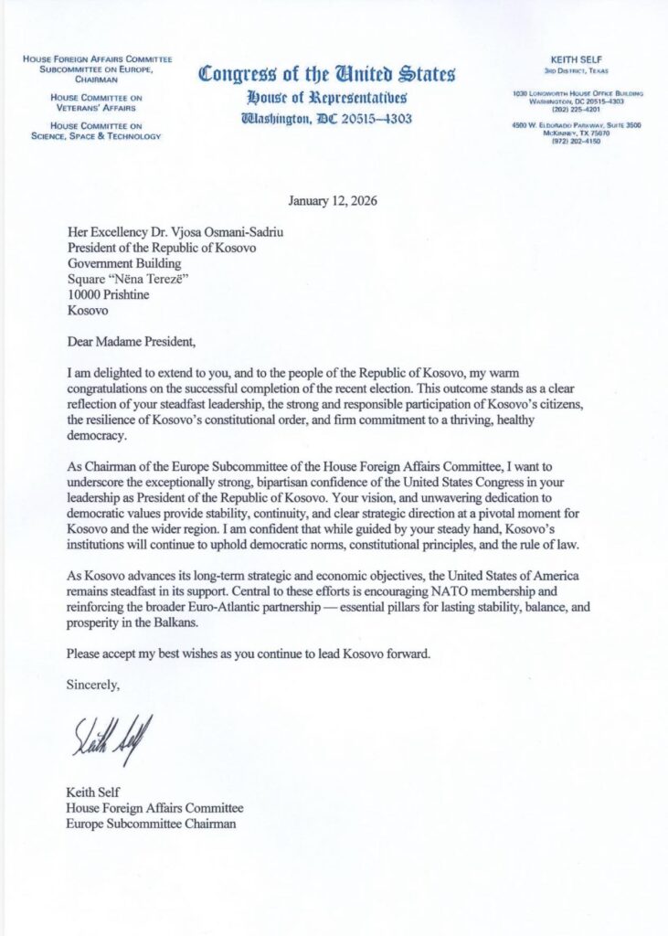 “I want to underline the extremely strong and bipartisan confidence of the United States Congress in your leadership as President of the Republic of Kosovo,” Congressman Self wrote in his letter of support.