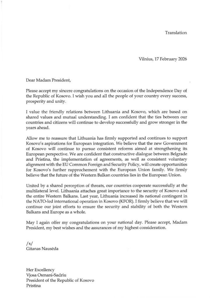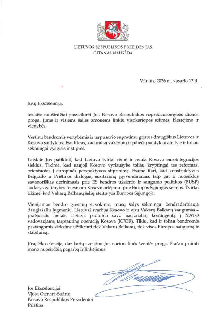 In his message, President Nausėda expresses his most sincere congratulations to President Osmani and the people of Kosovo, wishing success, prosperity and unity for the country. He emphasizes the friendly relations between Lithuania and Kosovo, built on shared values and mutual understanding, and reaffirms Lithuania’s unwavering support for
