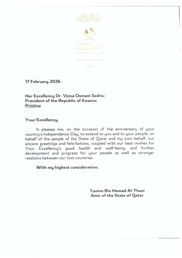 Lartmadhëria e Tij, Emiri i Shtetit të Katarit, Tamim bin Hamad Al Thani, dhe Lartmadhëria e Tij, Zëvendësemiri i Shtetit të Katarit, Abdullah bin Hamad Al Thani, kanë uruar Presidenten Osmani me rastin e përvjetorit të 18 të Pavarësisë