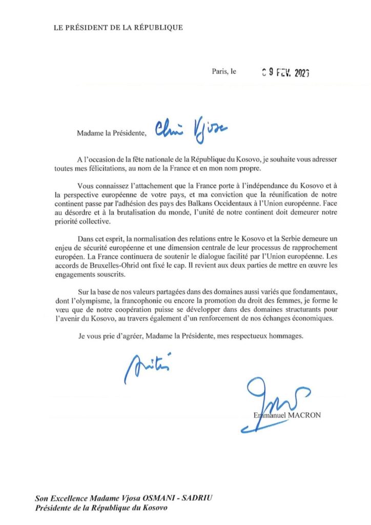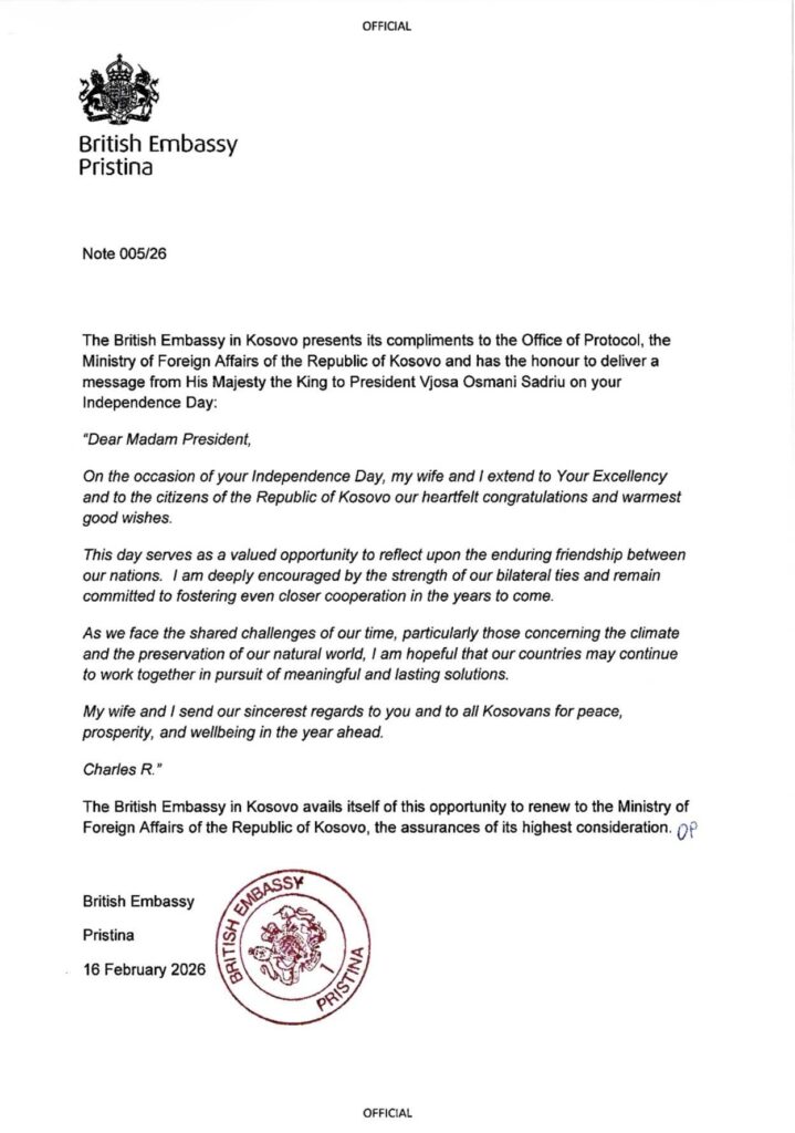 Presidentja e Republikës së Kosovës, Vjosa Osmani, në vazhdën e letrave të shumta të urimit nga liderë botërorë me rastin e përvjetorit të Pavarësisë së Republikës së Kosovës, ka pranuar mesazhe urimi edhe nga Mbreti i Mbretërisë së Bashkuar, L.T. Charles III, Presidenti i Republikës Federale të Gjermanisë, Frank-Walter Steinmeier, Presidenti i Republikës Franceze, Emmanuel Macron dhe Presidenti i Republikës Italiane, Sergio Mattarella.
