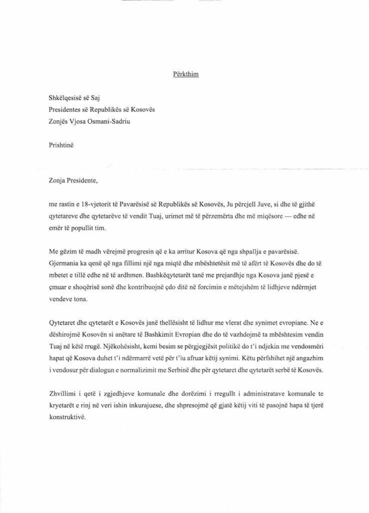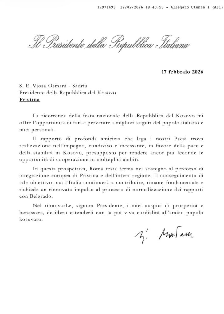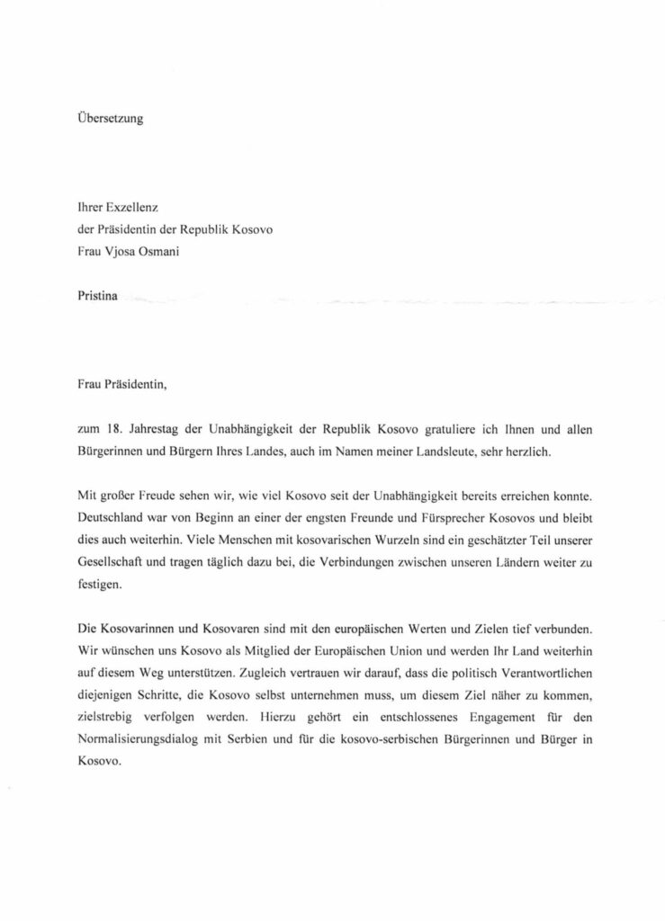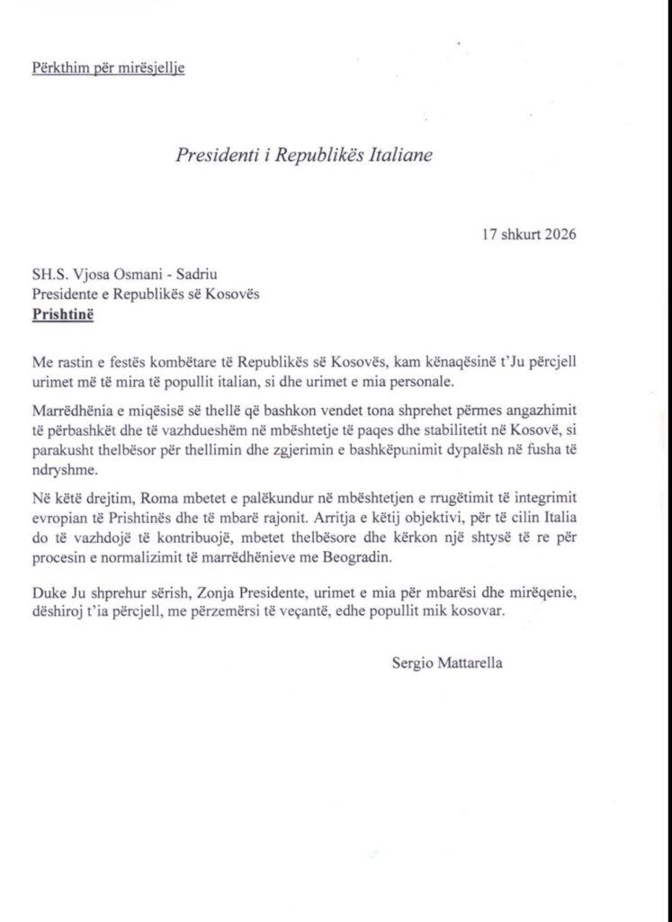 Në letrat e tyre, liderët kanë përcjellë urimet më të përzemërta për Presidenten Osmani dhe qytetarët e Republikës së Kosovës, duke theksuar përkushtimin për forcimin e mëtejmë të marrëdhënieve dypalëshe, mbështetjen për integrimin euroatlantik të Kosovës, si dhe për paqen, stabilitetin dhe prosperitetin në rajon dhe më gjerë.
