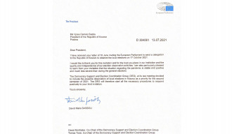 E Enjte / 15.07.2021 17:49:56 Presidenti Sassoli i konfirmon Presidentes Osmani praninë një delegacioni në Republikën e Kosovës për të vëzhguar zgjedhjet lokale të 17 tetorit 2021 Presidentja e Republikës së Kosovës Vjosa Osmani ka pranuar letër nga Presidenti i Parlamentit Evropian, David Maria SASSOLI, p&eu...