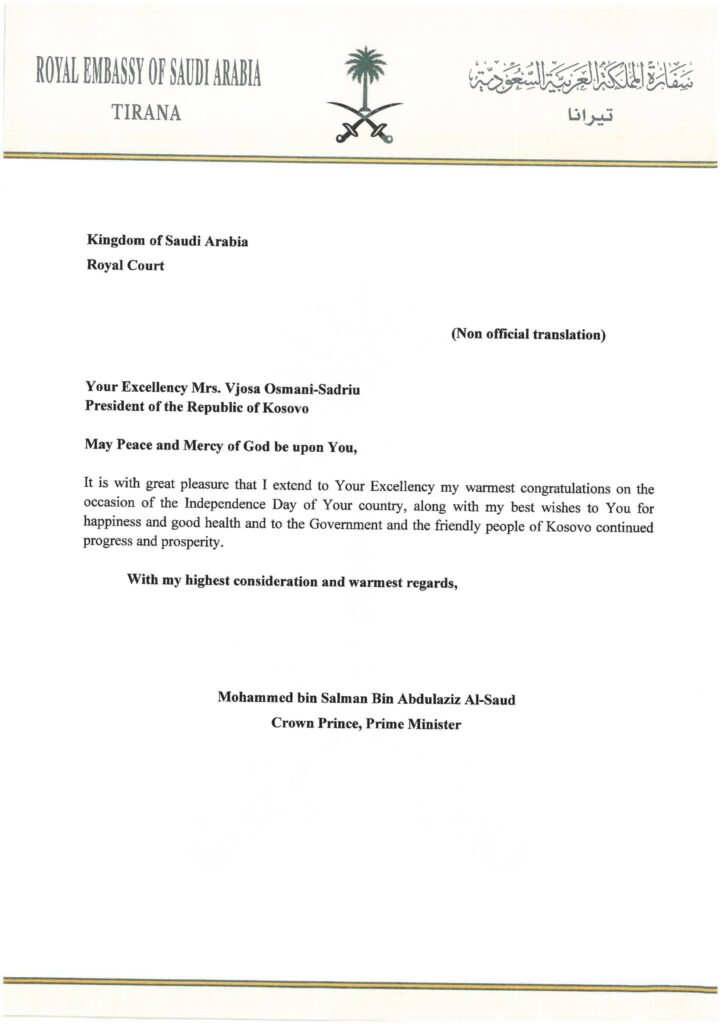 U svojim porukama, čuvar dve Svete džamije, kao i prestolonaslednik i premijer Saudijske Arabije, preneli su najtoplije čestitke predsednici Osmani, institucijama i prijateljskom narodu Kosova, želeći zdravlje, sreću, napredak i dalji prosperitet zemlji.