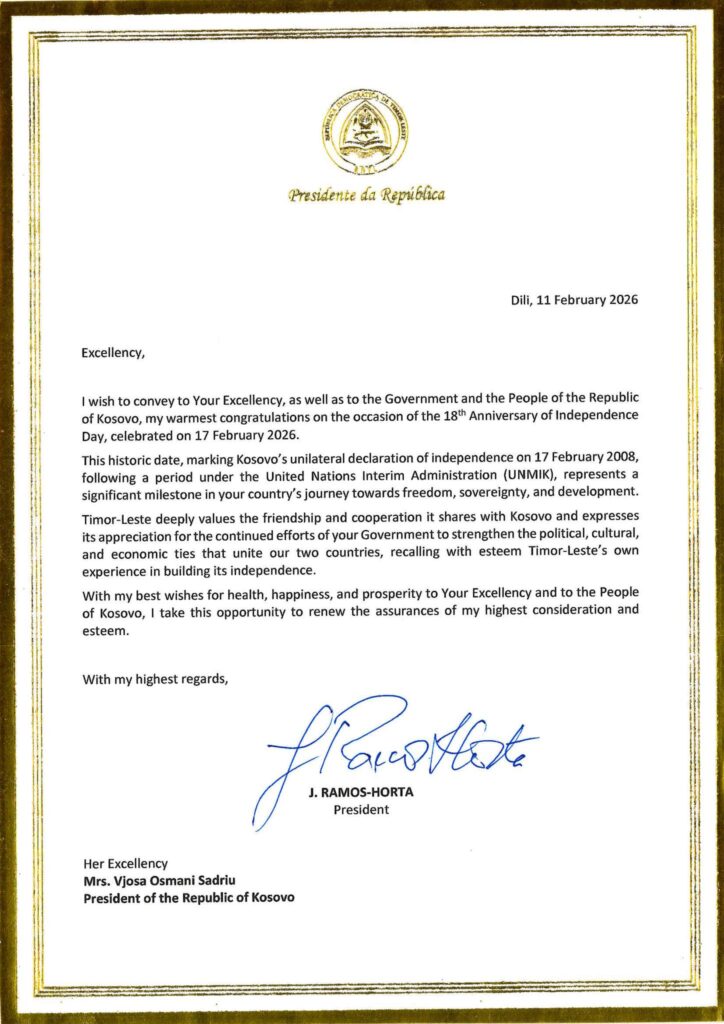 Predsednica Republike Kosovo, Vjosa Osmani, primila je pismo čestitke od predsednika Demokratske Republike Istočni Timor, José Ramosa-Horte, povodom 18. godišnjice nezavisnosti Kosova.